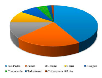 Finalmente, se decidió relevar como casos de estudio a los sectores de Tomé Alto, en la comuna de Tomé; Cosmito, en el límite entre las comunas de Penco y Concepción; Boca Sur, en la comuna de San Pedro de la Paz; y Lagunillas, en la comuna de Coronel, dado que presentan características comunes y singulares que permiten su comparación. Los casos escogidos se georreferenciaron en software QGIS 2.0, ejecutado en sistema operativo Ubuntu, basado en la plataforma GNU/Linux de código abierto, y se ordenó su distribución por comuna, tal como exhibe la Tabla 1 y la Figura 3.