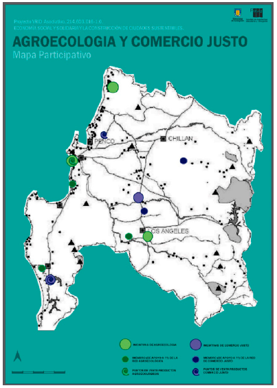 A detailed analysis of the results obtained allows identifying an underlying relationship between the origin of the projects studied, the associative structure they have adopted and the effectiveness of the results associated to the proposed agroecological indicators. In general, in 2 out of 3 experiences analyzed, the base organizations have been key for building associative networks, presenting a critical posture towards the agroindustrial model that, in Chile, has taken on an extractivist character. Likewise, in those cases with consolidated base organizations, after several decades, the agroecological experiences have been acknowledged by local public policy and incorporated into the territorial planning tools. This corroborates the importance of strengthening civil society in agroecological practices, as agents who are capable of leading productive, ecological and social processes, generating suitable proposals for the sustainable organization of the cities (Soler & Rivera, 2010). To aim at this, the research created a participative mapping with the relevant territorial players, which allowed locating the main points of interest for producers, sellers and consumers (Figura 11).