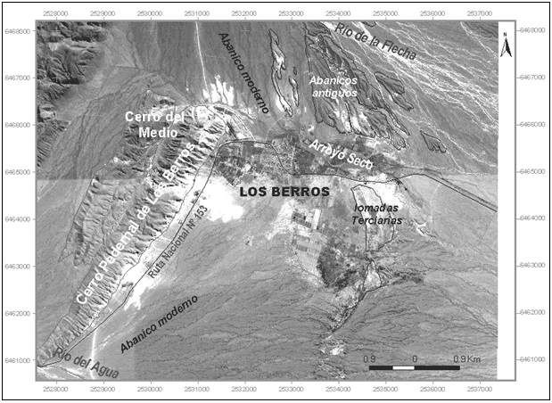 El Distrito Minero Los Berros se caracteriza por la presencia del Cerro Pedernal de Los Berros y Cerro del Medio (Figura 2). Litológicamente este cordón montañoso está integrado por calizas y dolomías de edad Ordovícica que constituyen la materia prima objeto de la explotación minera (Ortiz y Zambrano, 1981). Adosado a este cordón, se encuentran las bajadas pedemontanas y abanicos aluviales (antiguos y modernos), constituidos por sedimentos aluvionales detríticos de tamaños variados de edad Cuaternaria.