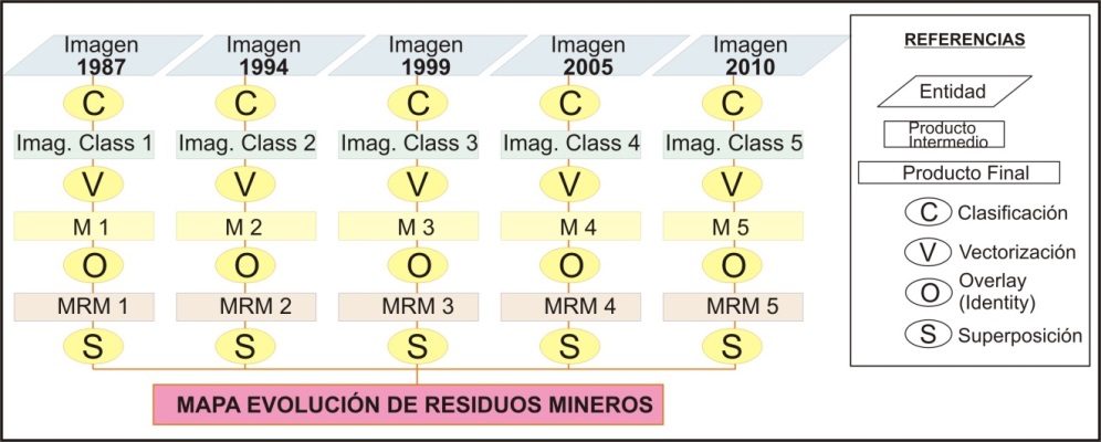 Para la realización de este trabajo se empleó un modelo cartográfico, que permite la organización de las actividades y una mejor planificación de los procesos de análisis con el que se tratará la información, en función a los objetivos que se desean cumplir. Este modelo (Figura 3) indica los pasos que se siguieron para obtener una cartografía final, en donde se encuentran representadas las manchas de residuos y cómo han ido evolucionando a través de los años (Negrelli, 2013).