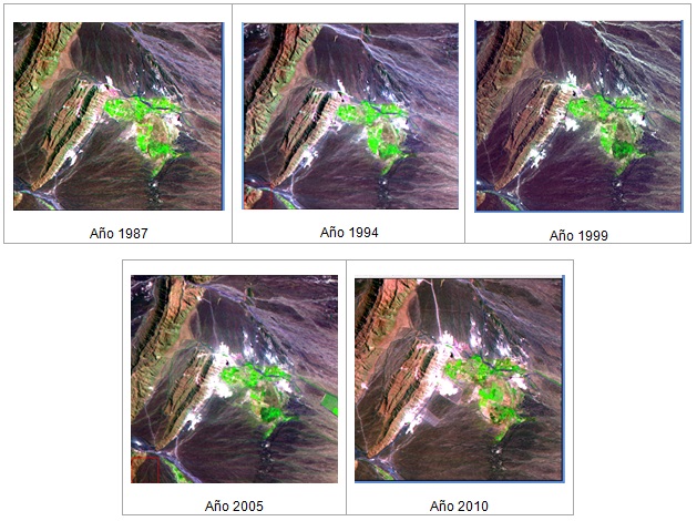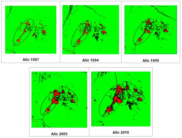 A partir de la imagen del año 1999, se pueden apreciar nuevas manchas en el sector Noreste, que van creciendo progresivamente hasta alcanzar su mayor tamaño en el año 2010.
