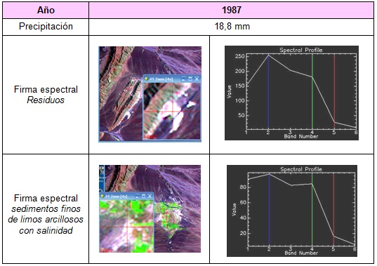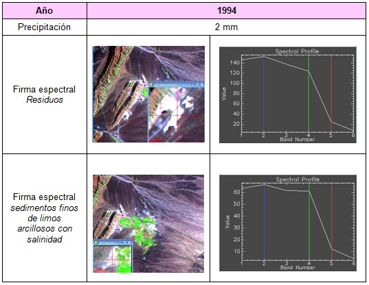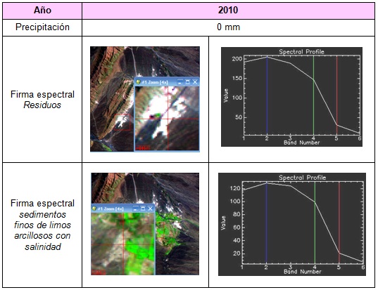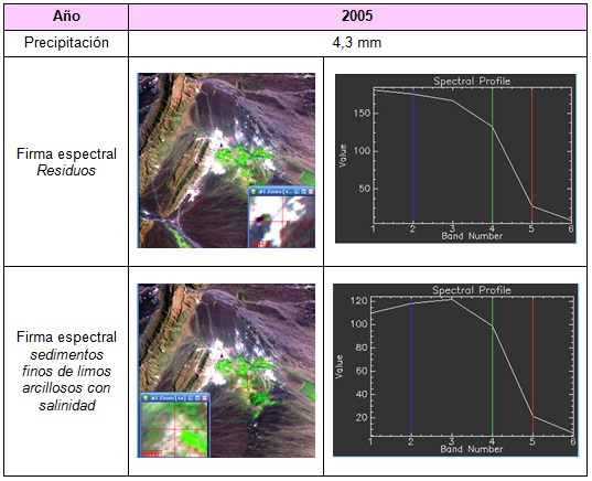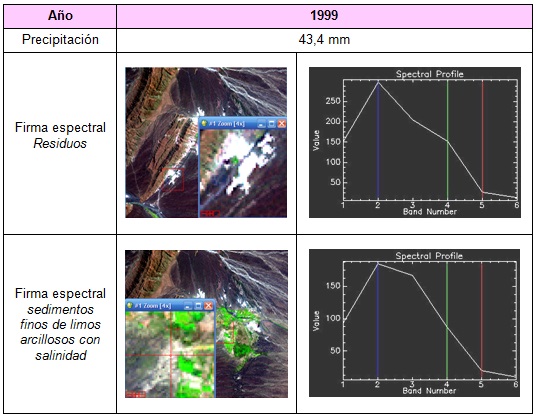 En base al análisis de las firmas espectrales, se puede observar que los residuos mineros tienden a presentar en la banda 3 de las imágenes satelitales de los años considerados, menor reflectancia espectral que las áreas constituidas por sedimentos arcillosos salinos. Esta banda es la que permite la diferenciación espectral entre ambas coberturas (sedimentos finos de limos arcillosos con contenidos salinos y residuos mineros).