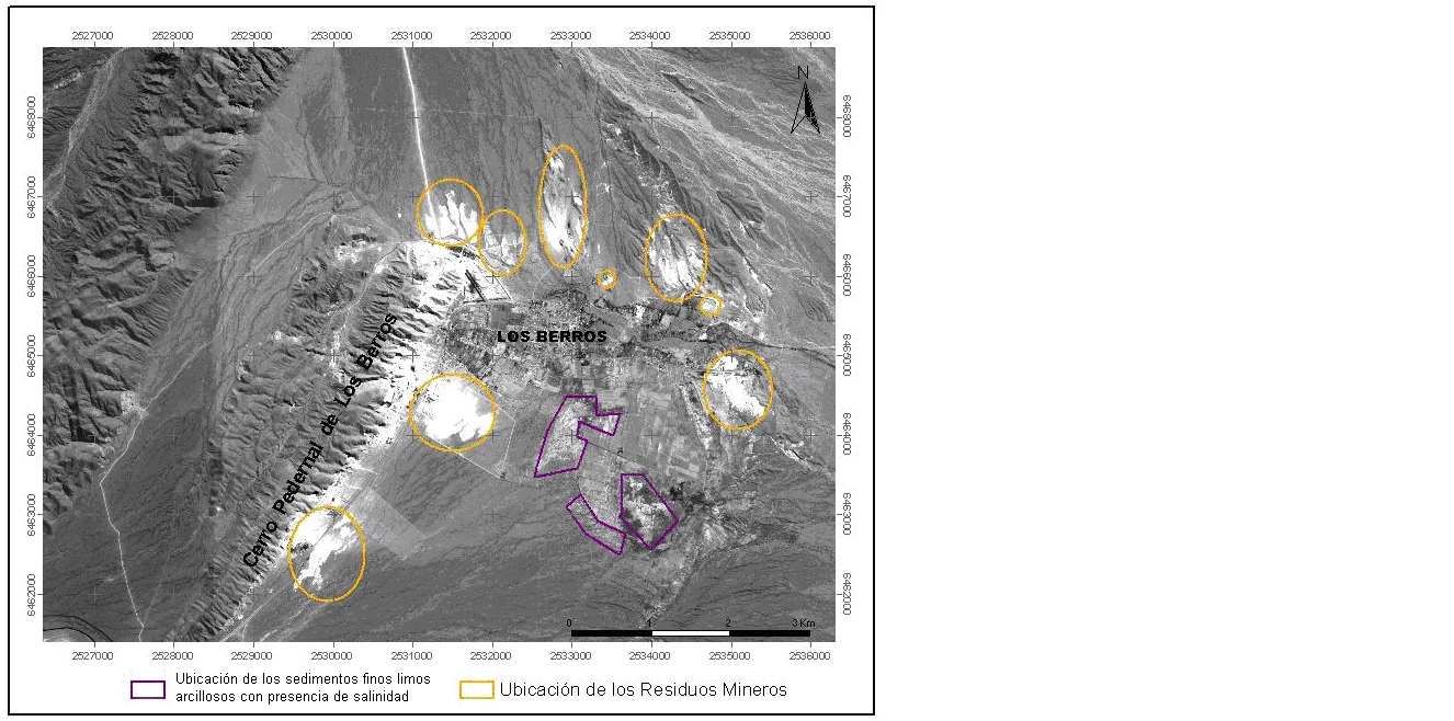 En la imagen satelital de alta resolución espacial correspondiente al año 2011, se diferenciaron los sectores con residuos mineros producto de la actividad calera, de las áreas con la presencia de sedimentos finos de limos arcillosos con salinidad (Figura 10).