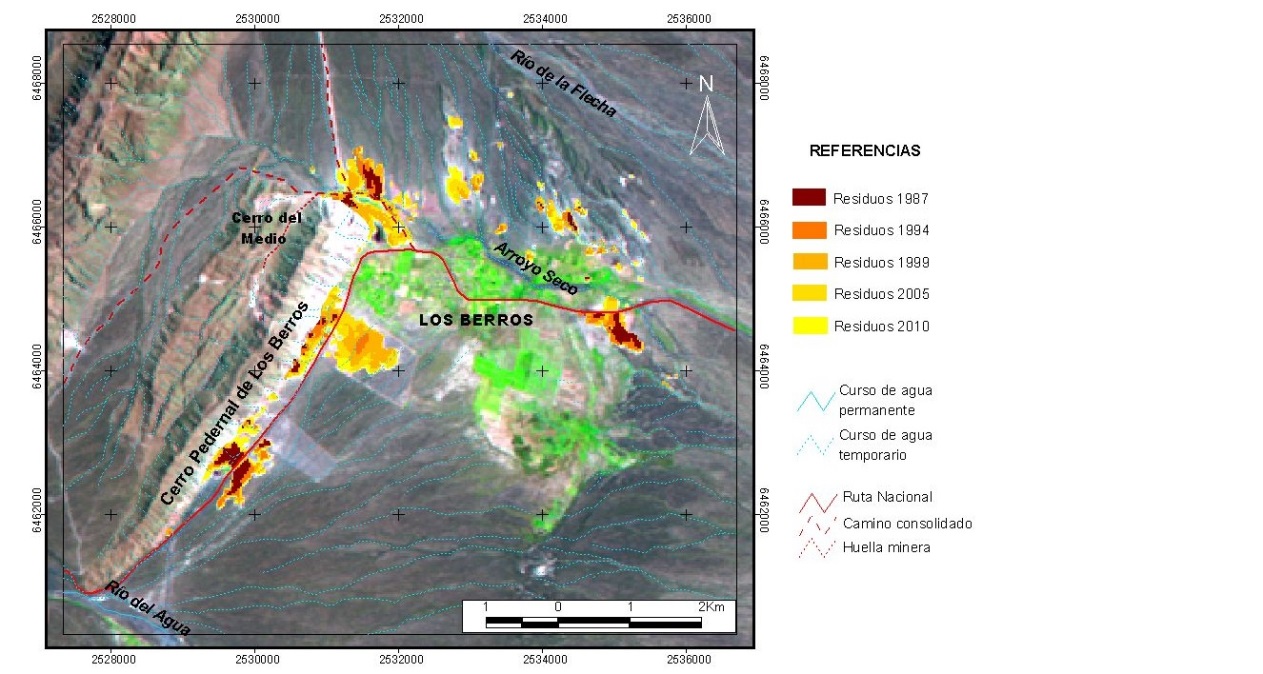 Los residuos mineros se localizan principalmente sobre el flanco oriental del Cerro Pedernal de Los Berros, con un aumento paulatino de las manchas desde el año 1987 hasta el 2010.