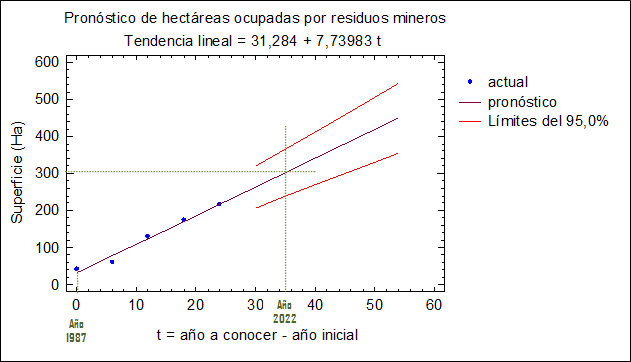En un segundo análisis se usó el programa estadístico STATGRAPHICS que aplica el Método Pronóstico en el Tiempo (Mendenhall et al, 1986). Dicho programa proporciona un modelo de tendencia lineal en el tiempo, pronosticando el crecimiento de los residuos mineros y los límites del intervalo de confianza que permiten estimar los rangos de crecimiento.