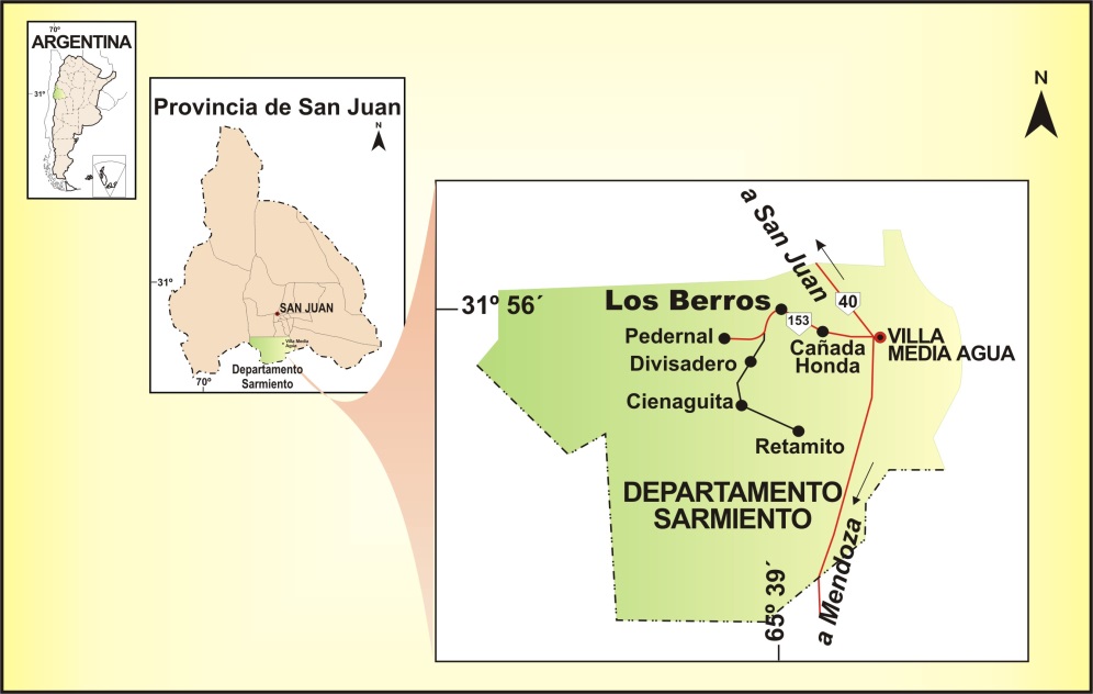 La Localidad de Los Berros, ubicada al Oeste del Departamento Sarmiento (Figura 1), es uno de los centros caleros más importantes de la Provincia de San Juan, Argentina. Dista de la capital provincial aproximadamente 80 km en dirección SSO y está emplazado a 700 m.s.n.m.
