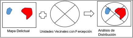 Sobre la base de estos hotspot, se realiza un análisis considerando el contexto urbano y se asocian espacialmente con las unidades vecinales, sumado a la percepción de seguridad pública resultante en las encuestas, por medio del procesamiento en el software ArcGis 10.4. Sobre la base de esta asociación analizan los agrupamientos y distribución de los delitos en el territorio.