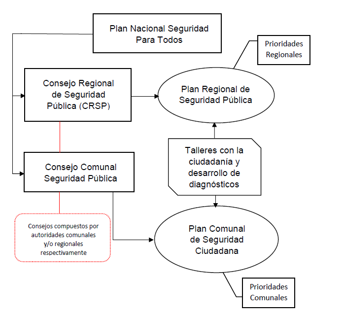 En los últimos años ha existido una alta inyección de recursos por parte del Estado en materia de seguridad Pública, Intentando tratar esta en diferentes dimensiones territoriales generando instancias de coordinación nacional, regional, y comunal. Bajo esta premisa, en el marco del Plan Nacional Seguridad Para Todos es que Cada comuna debe implementar un Consejo Comunal de Seguridad Pública y cada región debe contar con un Consejo Regional de Seguridad Pública (CRSP), conformado por el Intendente regional e integrado por diversas instituciones, el que diseña un Plan Regional de Seguridad Pública (ver cuadro coordinación), el cual contempla acciones en las dimensiones de: Prevención, control, vínculo con la comunidad y difusión.