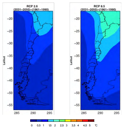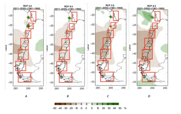 El país ya enfrenta un aumento de la temperatura y se espera que entre los años 2011 al 2030 los valores “fluctúan entre los 0,5 º C para la zona sur y los 1,5 º C para la zona norte grande y altiplánica” (Ministerio de Medio Ambiente, 2014, p. 9), como se señala en la figura 1, con respecto a las precipitaciones “para el periodo cercano, entre los años 2011 y 2030, se proyectan disminuciones de precipitaciones entre 5 y 15%, para las latitudes 27ºS a 45ºS, esto es entre la cuenca del río Copiapó y la cuenca del río Aysén” (Ministerio de Medio Ambiente, 2014, p. 9), la figura 2 muestra los cambios antes descritos y las proyecciones para los siguientes años.