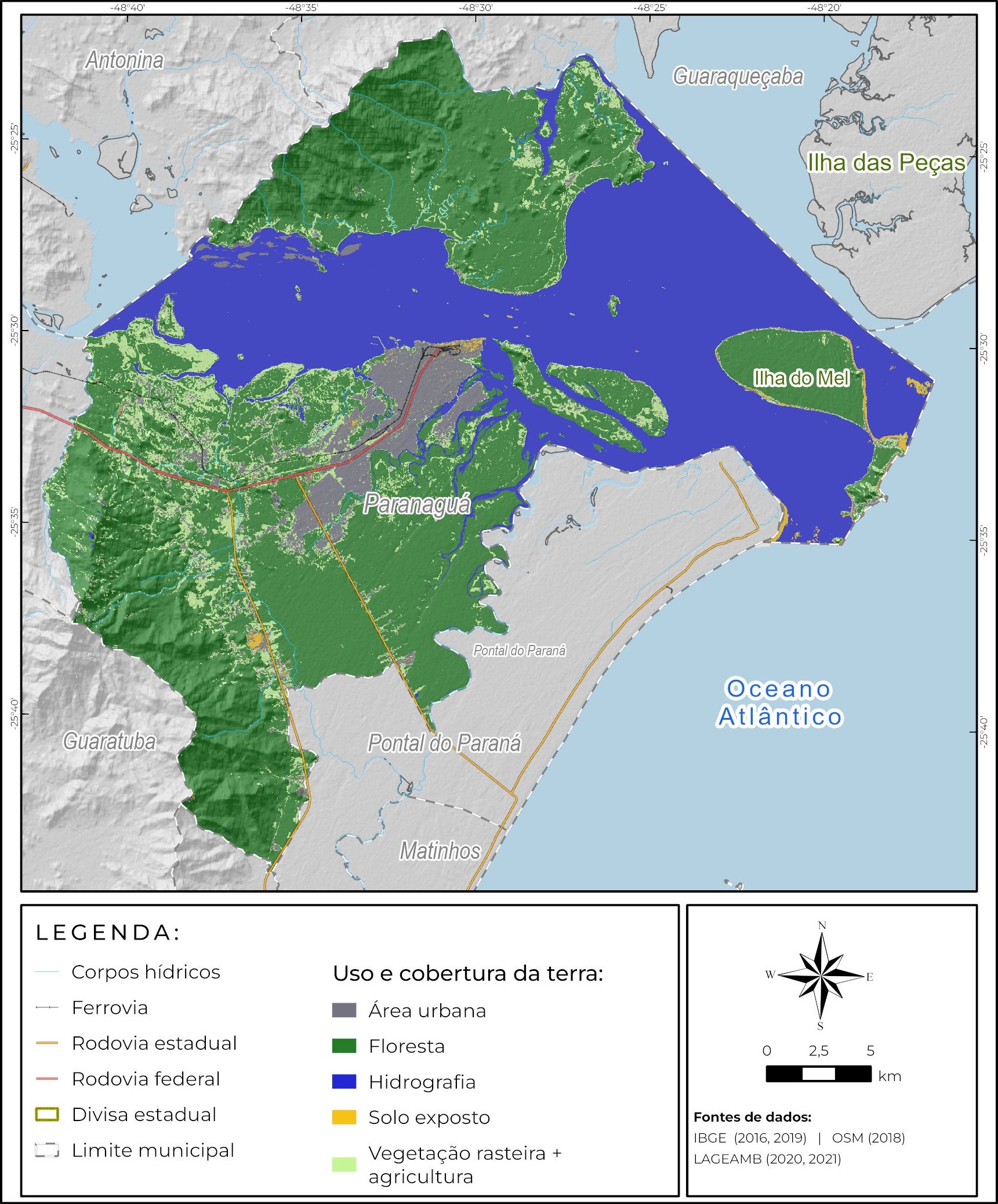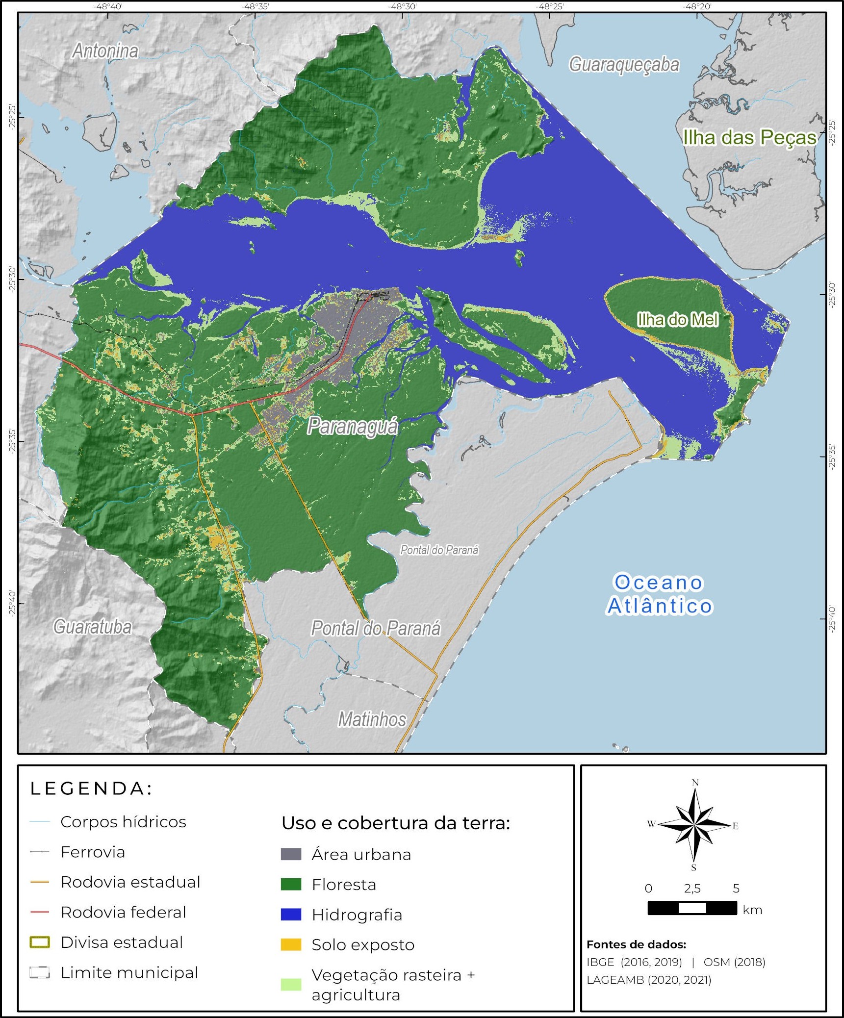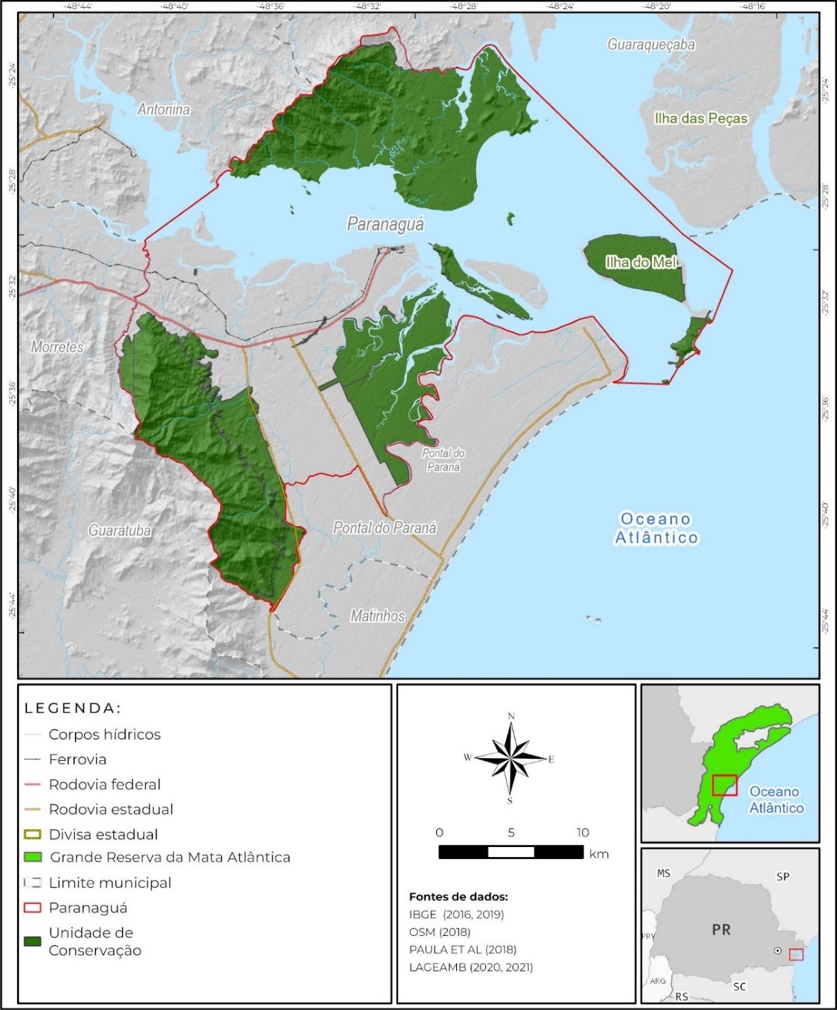 Assim, considerando os desafios de conservação e recuperação da Mata Atlântica, o objetivo desse trabalho foi o de detectar e analisar as mudanças de uso e ocupação da terra para os anos 2000 e 2020, tendo como área de estudo o município de Paranaguá/PR, o qual integra a Grande Reserva da Mata Atlântica. Mais especificamente, serão produzidos mapas de uso e ocupação da terra a partir de imagens de satélite da coleção Landsat.